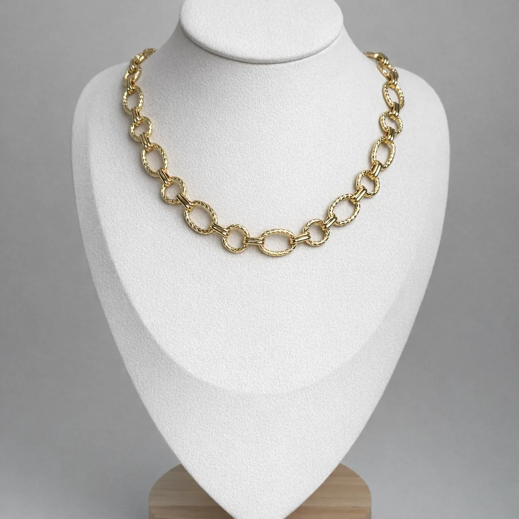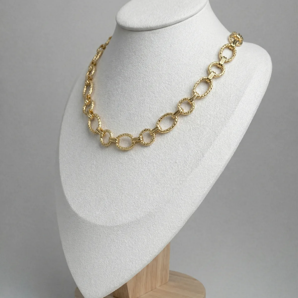 Цепь «Аврора» из коллекции «Эссенс» — базовое украшение с крупными овальными звеньями и роскошным золотистым покрытием. Лаконичный, но выразительный дизайн позволяет носить такое колье как самостоятельный акцент в образе или сочетать его с другими украшениями. Подчёркивает индивидуальность, подходит для повседневных, деловых и вечерних комплектов.