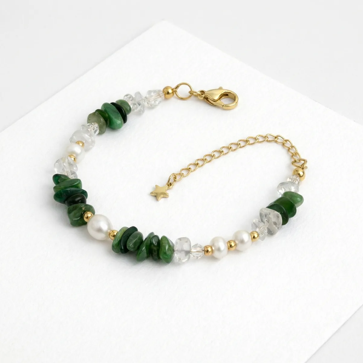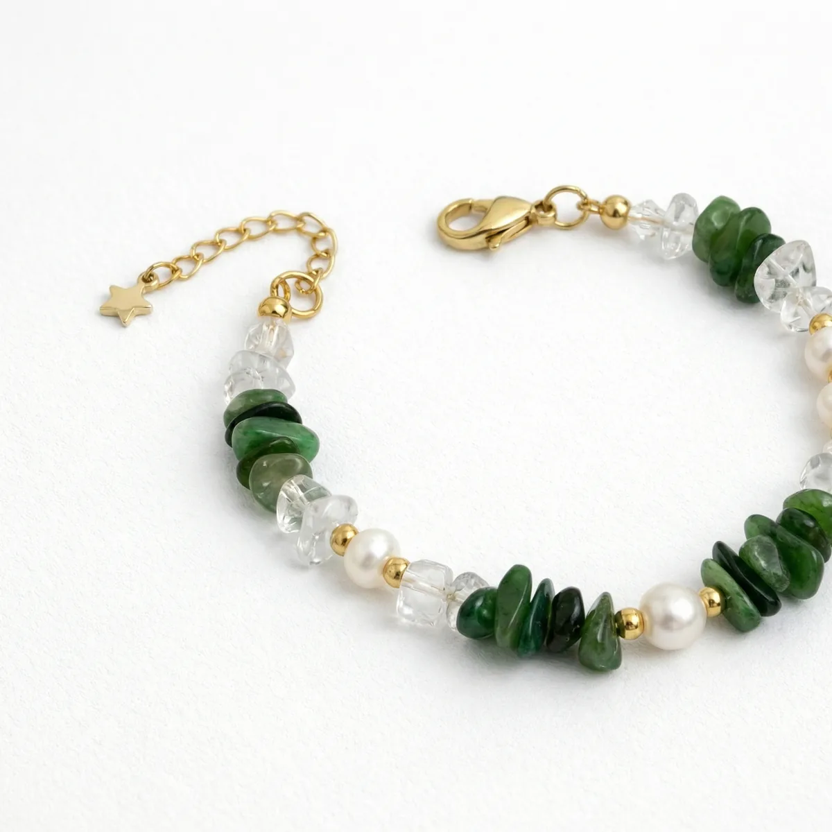 Браслет «Нефрит» — стильное украшение с натуральным зелёным нефритом, горным хрусталём, жемчугом и золотистыми элементами. Глубокий природный оттенок нефрита в сочетании с сиянием хрусталя и жемчуга создаёт изысканный, свежий и нарядный аксессуар, который подойдёт как для делового, так и для повседневного образа.