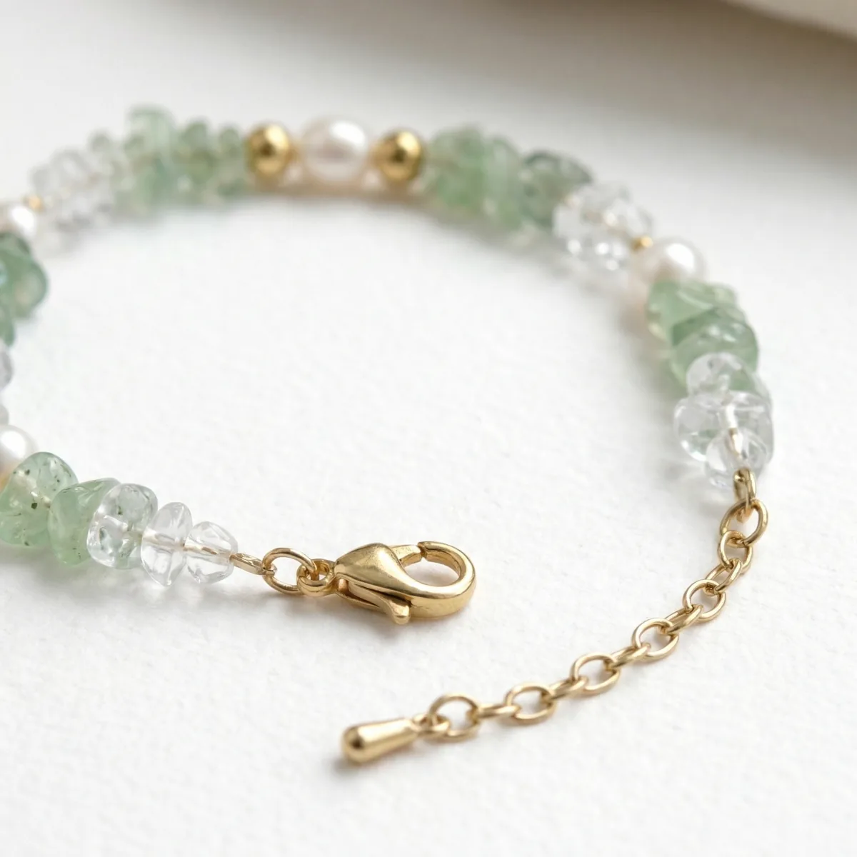 Браслет «Пренит» — нежное и воздушное украшение из натурального пренита приглушённого светло-зелёного оттенка, горного хрусталя, жемчуга и золотистых бусин. Благодаря своей утончённости и натуральной палитре браслет идеально подходит для летних, романтичных и повседневных образов.