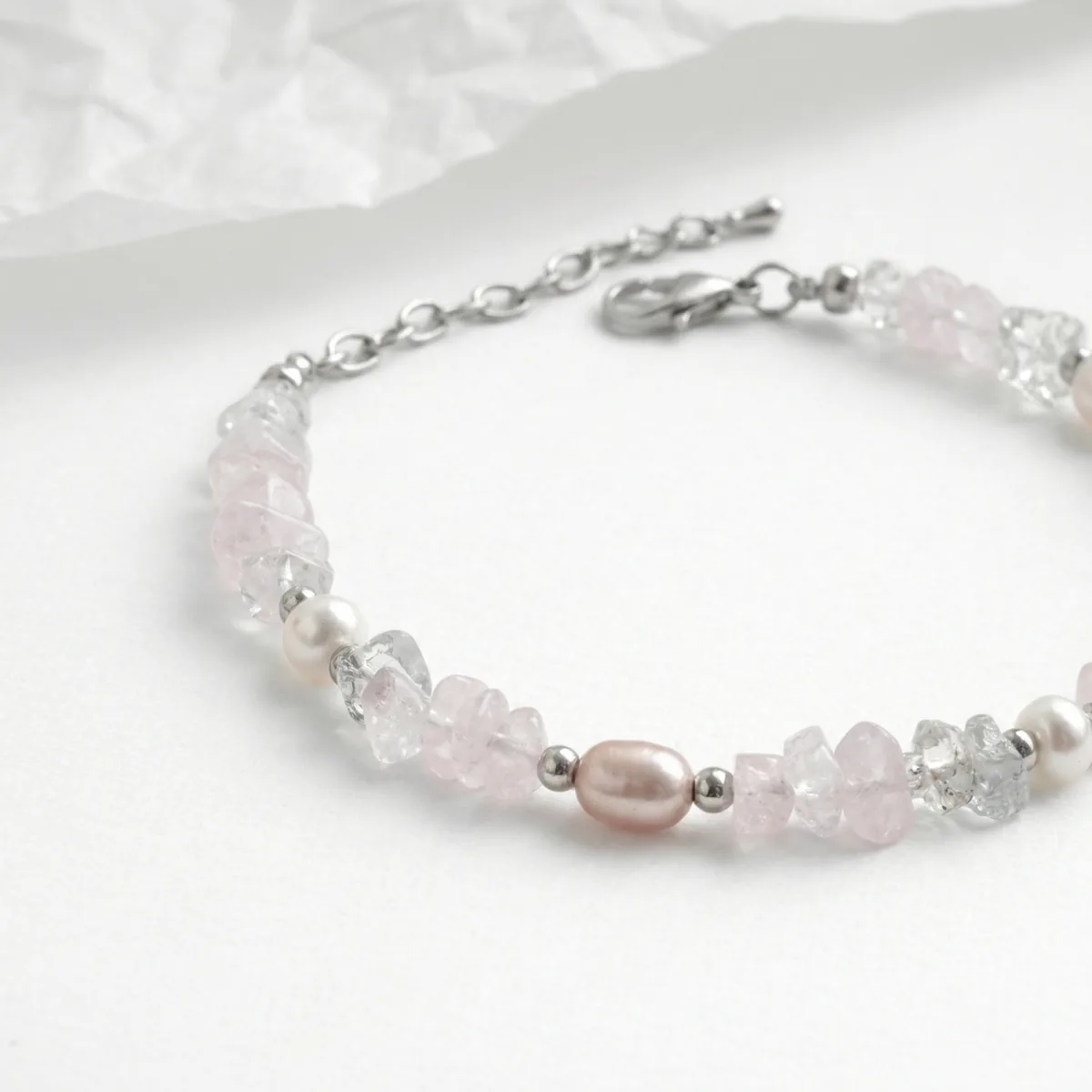 Браслет «Розовый кварц» — изящное украшение с натуральным розовым кварцем, горным хрусталём, жемчугом и серебристыми акцентами. Мягкий оттенок розового кварца подчёркивает женственность и гармонию, а сочетание с прозрачными и белыми деталями выглядит особенно свежо и подходит для светлых, романтичных и повседневных образов.