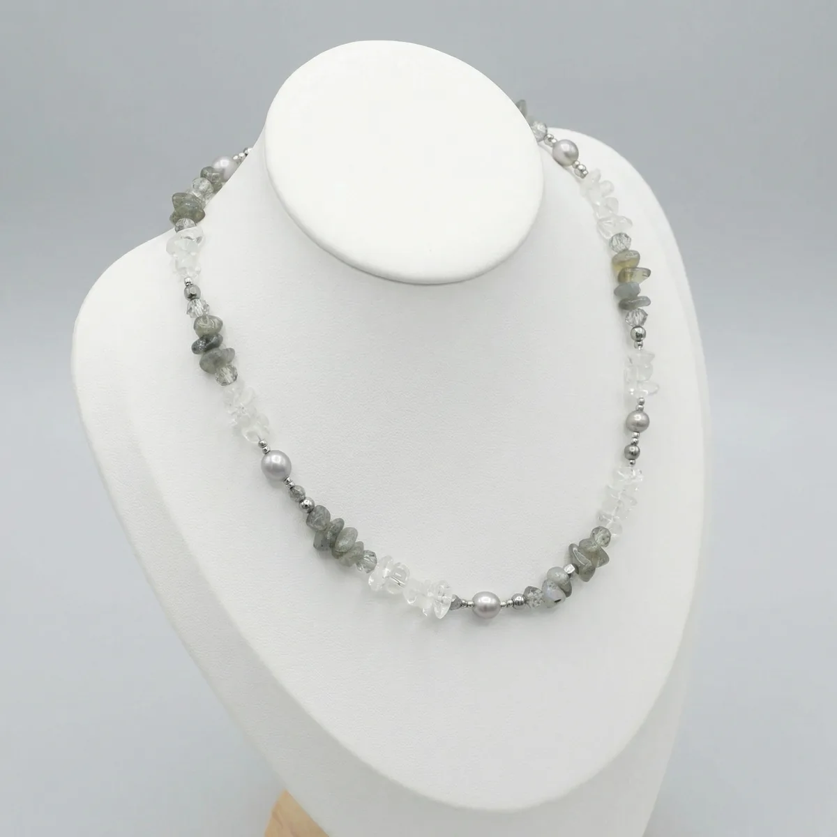 Чокер «Лабрадорит» — стильное украшение из натурального лабрадорита, дополненное горным хрусталём, жемчугом и серебристыми бусинами. Лёгкий, мерцающий отлив лабрадорита создает игру света и неповторимую глубину рисунка камня. Аксессуар универсален и добавит утончённости как повседневному, так и вечернему образу.