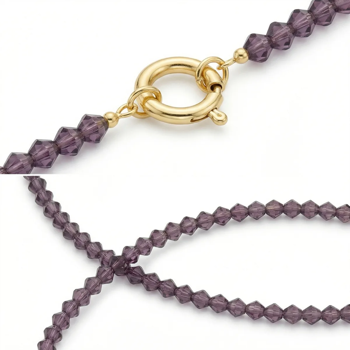 Лёгкий чокер из хрустальных бусин изящного лилового оттенка. Холодный сиреневый тон и деликатное мерцание фасетированных граней красиво играют на свету, добавляя образу мягкости и утончённого настроения.