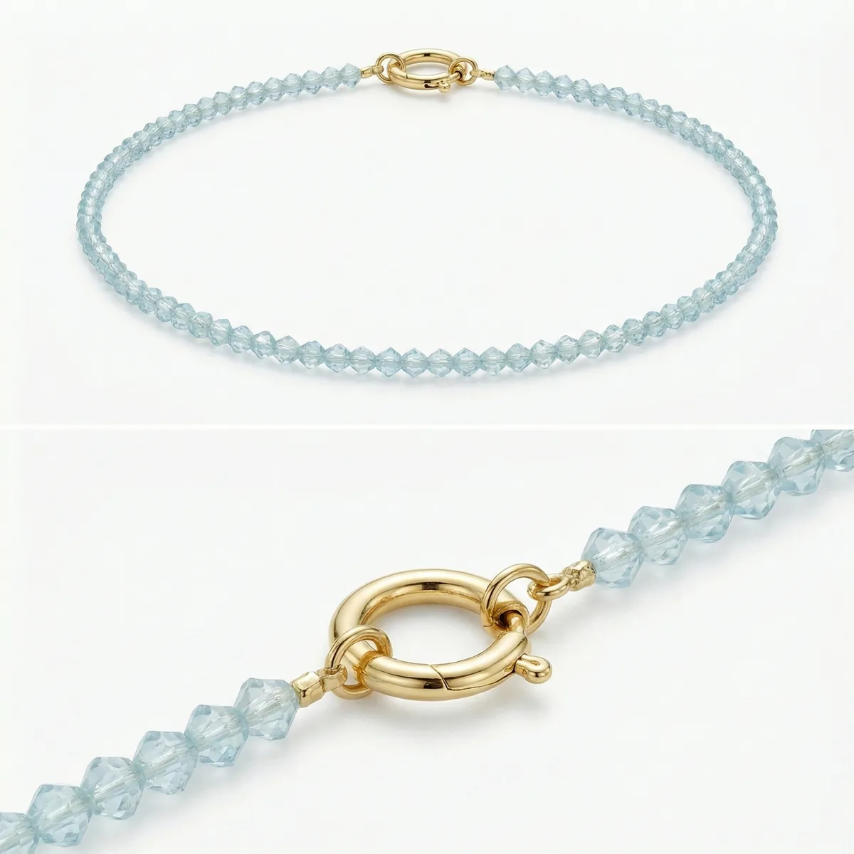 Лёгкий чокер из хрустальных бусин нежного ментолового оттенка. Свежий, прохладный цвет и деликатное сияние фасетированных граней не только украсят любой образ, но и создадут ощущение лёгкости и свежести.