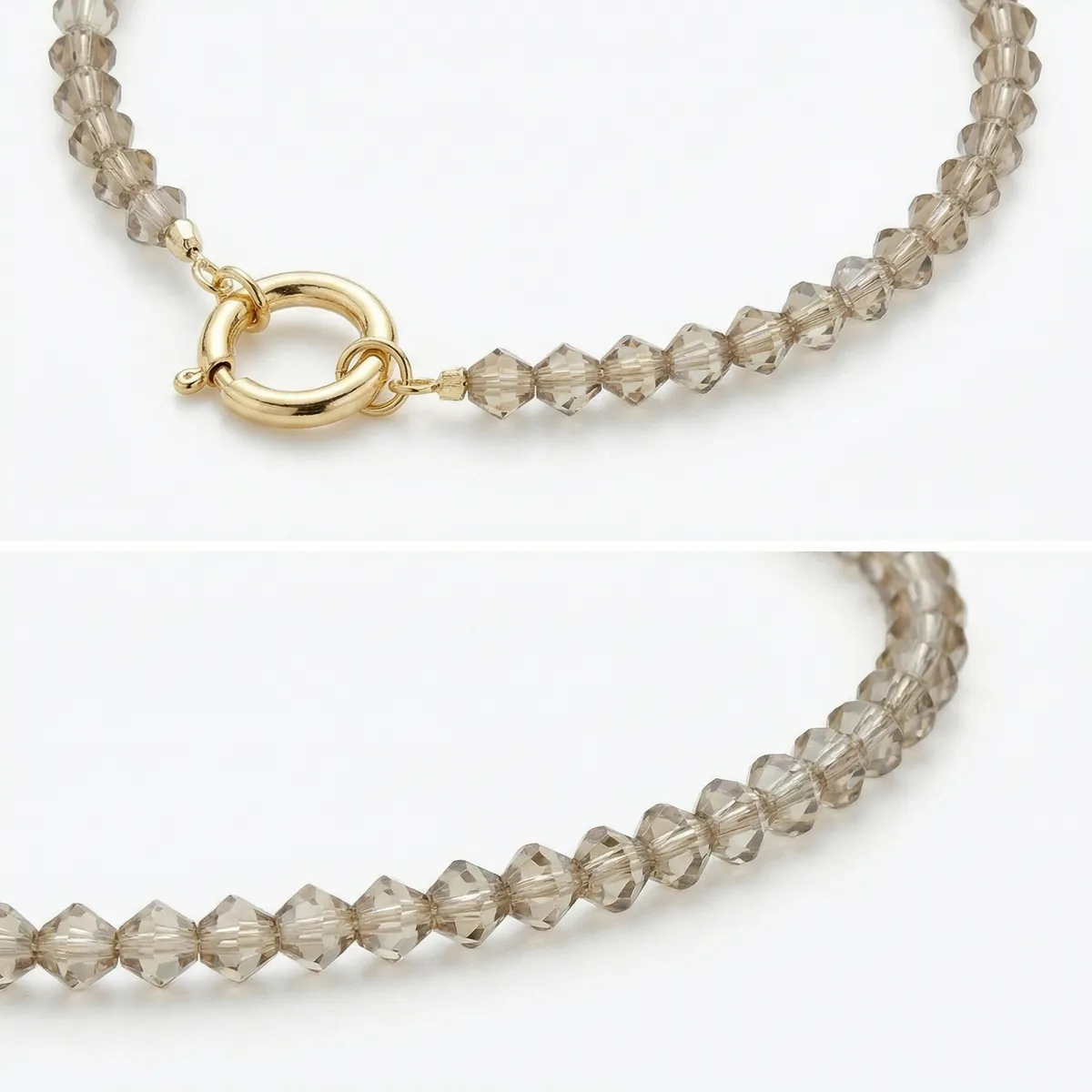 Лёгкий чокер из хрустальных бусин оттенка «шампанское». Светлый бежево-золотистый тон и деликатное сияние фасетированных граней создают мягкое, праздничное мерцание и добавляют образу аккуратной элегантности.