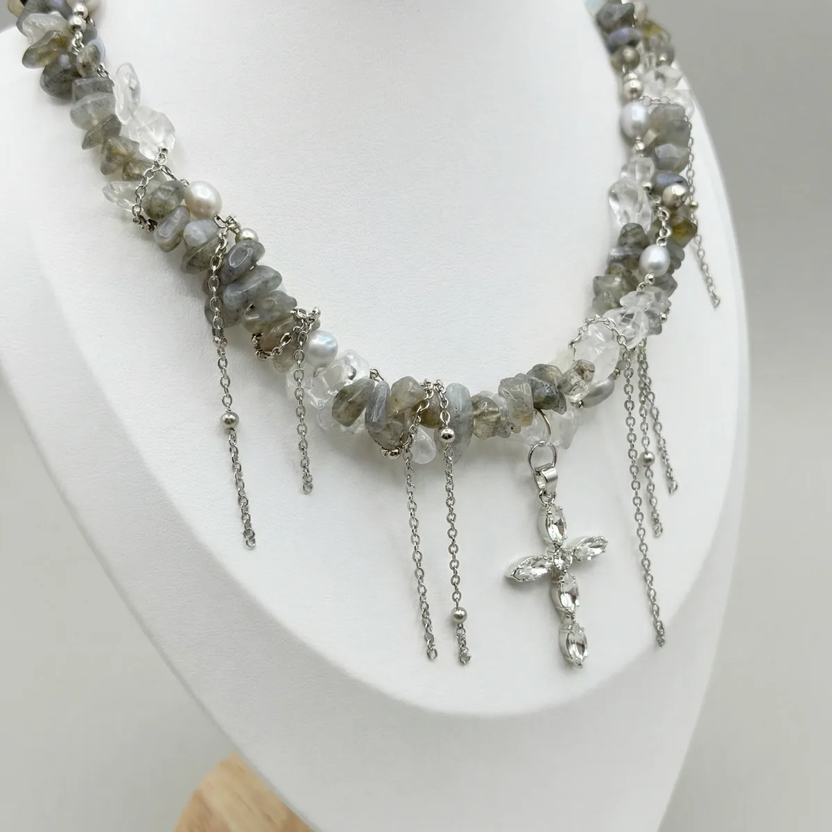 Колье «Лабрадорит» — стильное украшение с натуральным лабрадоритом, прозрачными кристаллами, жемчугом и серебристыми подвесками. Камни с характерным радужным иридисцентным отблеском в сочетании со светлым жемчугом и тонкими цепочками создают многослойный, играющий светом образ. Центральная подвеска-крест добавляет изделию выразительности, а универсальная серая гамма отлично сочетается с любой базовой одеждой.