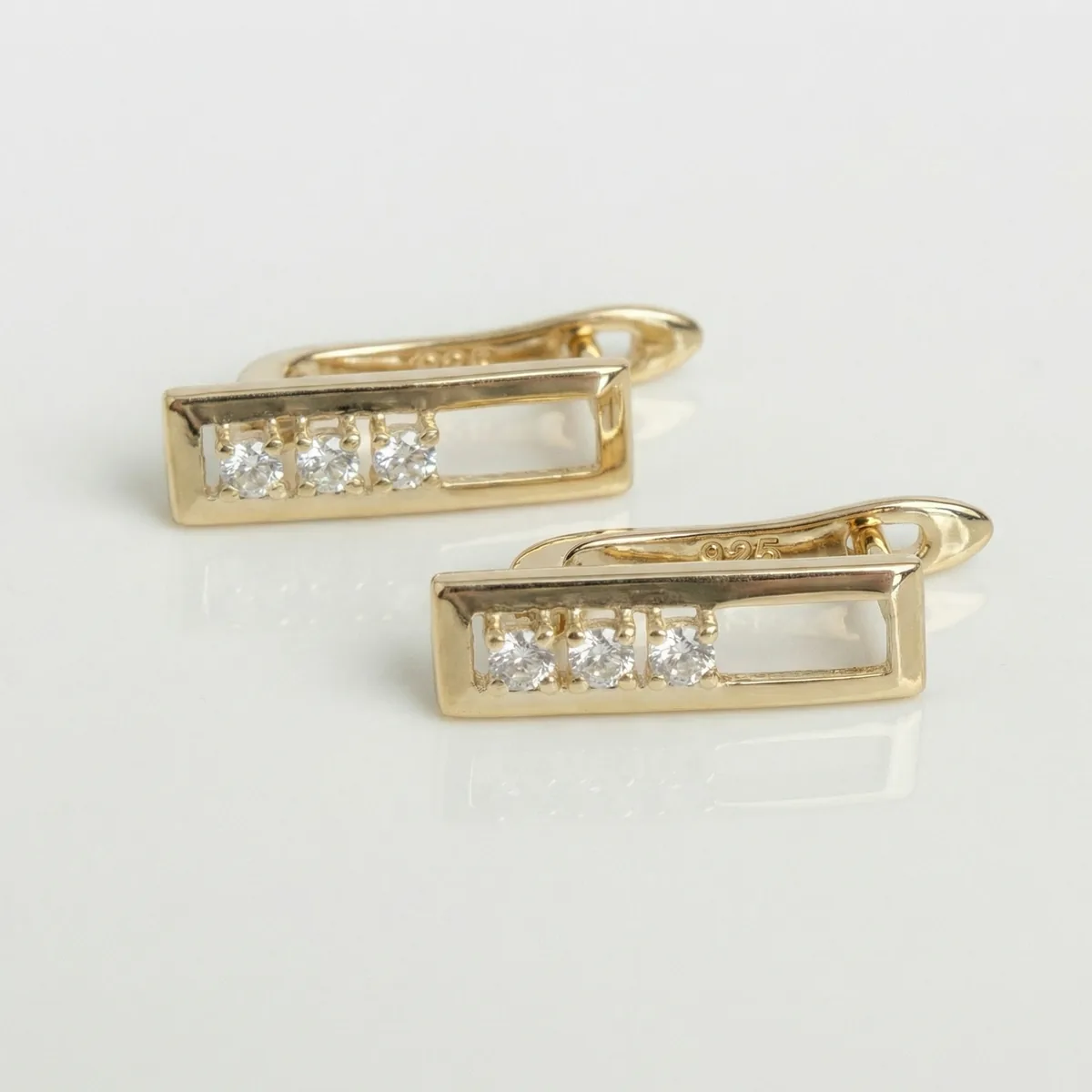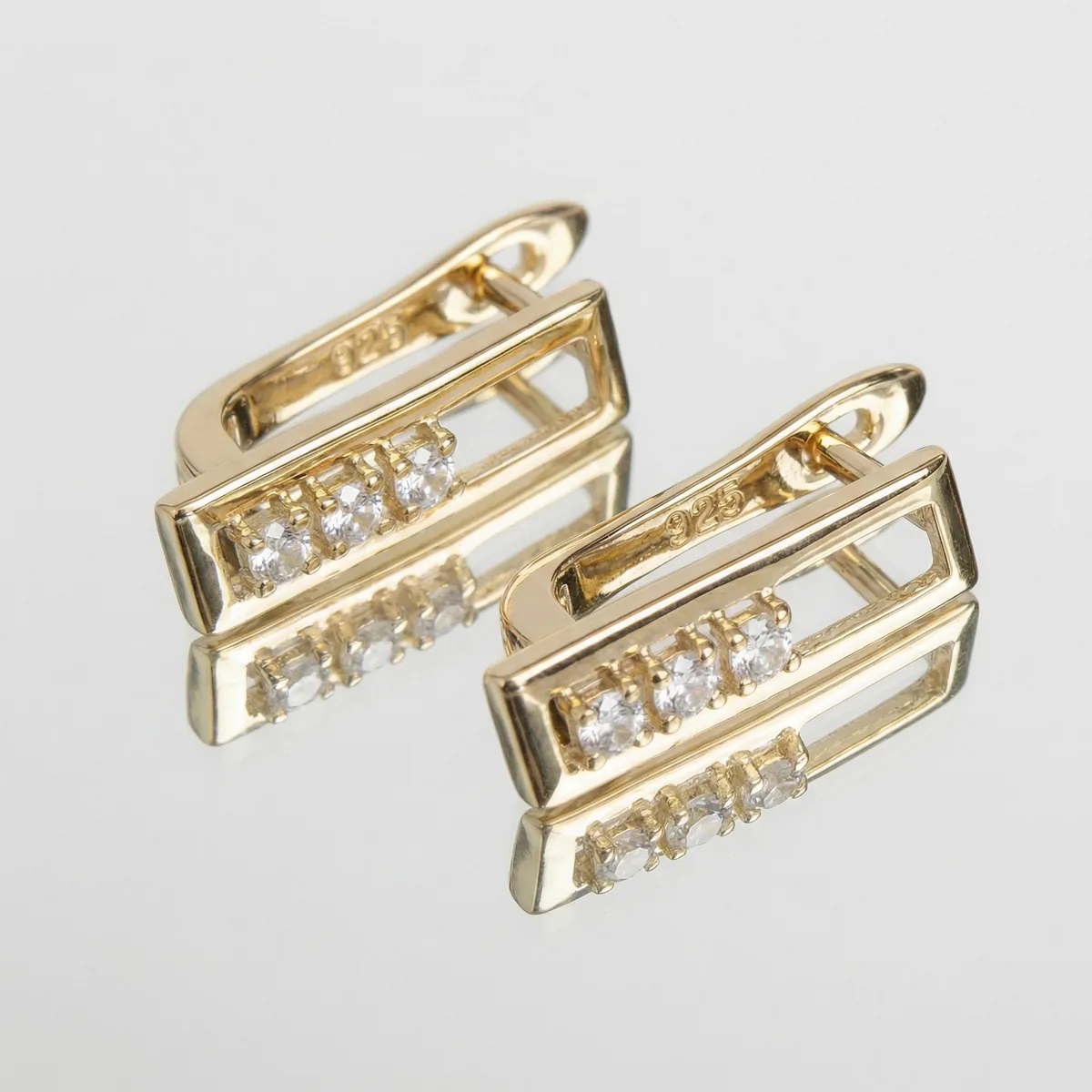 Серьги «Свет» в золотом исполнении — элегантные и стильные серьги с пятью сияющими кристаллами, утопленными в прямоугольную открытую оправу. Тёплый золотой оттенок подчеркивает драгоценный характер украшения и визуально делает акцент на сиянии камней. Современная геометрия и сдержанный блеск серьги делают их идеальным выбором для создания утончённого образа на каждый день и для особых случаев.