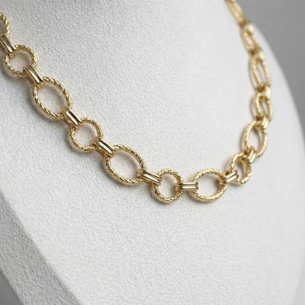 Цепь «Аврора» из коллекции «Эссенс» — базовое украшение с крупными овальными звеньями и роскошным золотистым покрытием. Лаконичный, но выразительный дизайн позволяет носить такое колье как самостоятельный акцент в образе или сочетать его с другими украшениями. Подчёркивает индивидуальность, подходит для повседневных, деловых и вечерних комплектов.