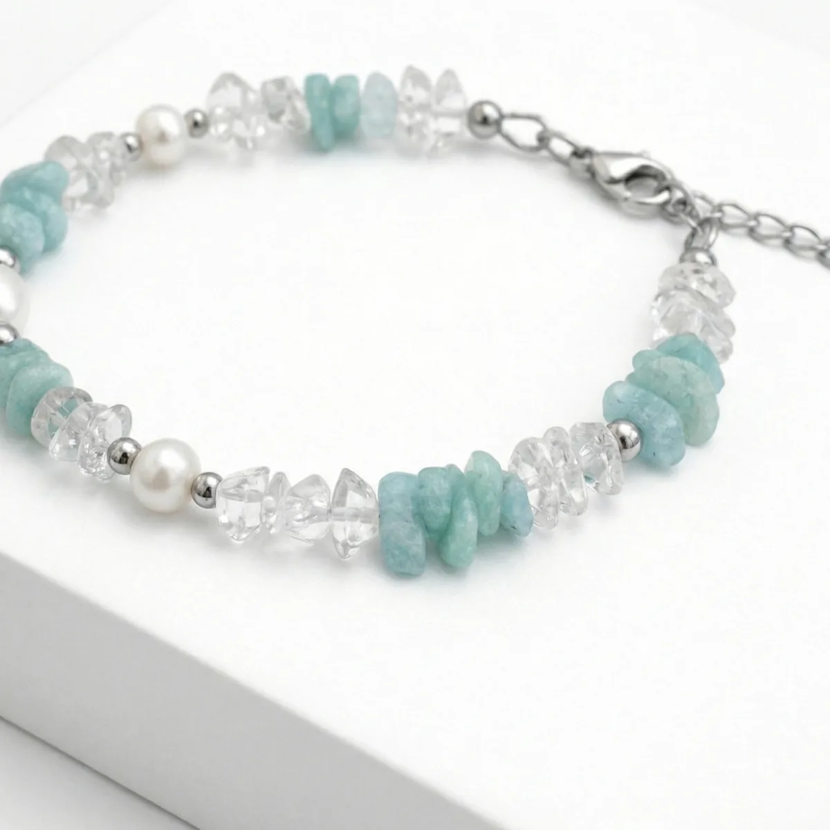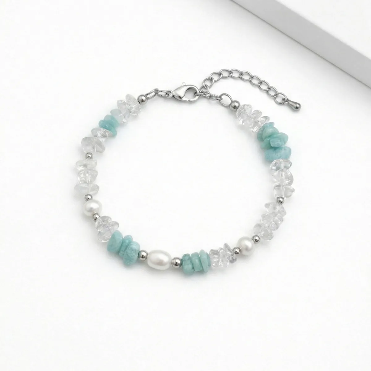 Браслет «Ларимар» — лёгкое и утонченное украшение с натуральным ларимаром, горным хрусталём, жемчугом и серебристыми бусинами. Природный аквамариново-голубой оттенок ларимара ассоциируется с морской свежестью и отлично впишется в летние и светлые городские образы.