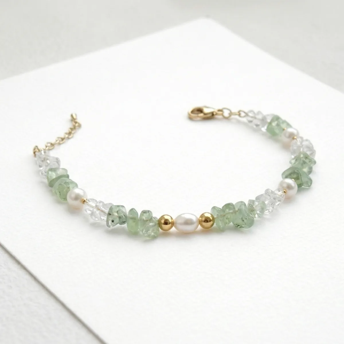 Браслет «Пренит» — нежное и воздушное украшение из натурального пренита приглушённого светло-зелёного оттенка, горного хрусталя, жемчуга и золотистых бусин. Благодаря своей утончённости и натуральной палитре браслет идеально подходит для летних, романтичных и повседневных образов.
