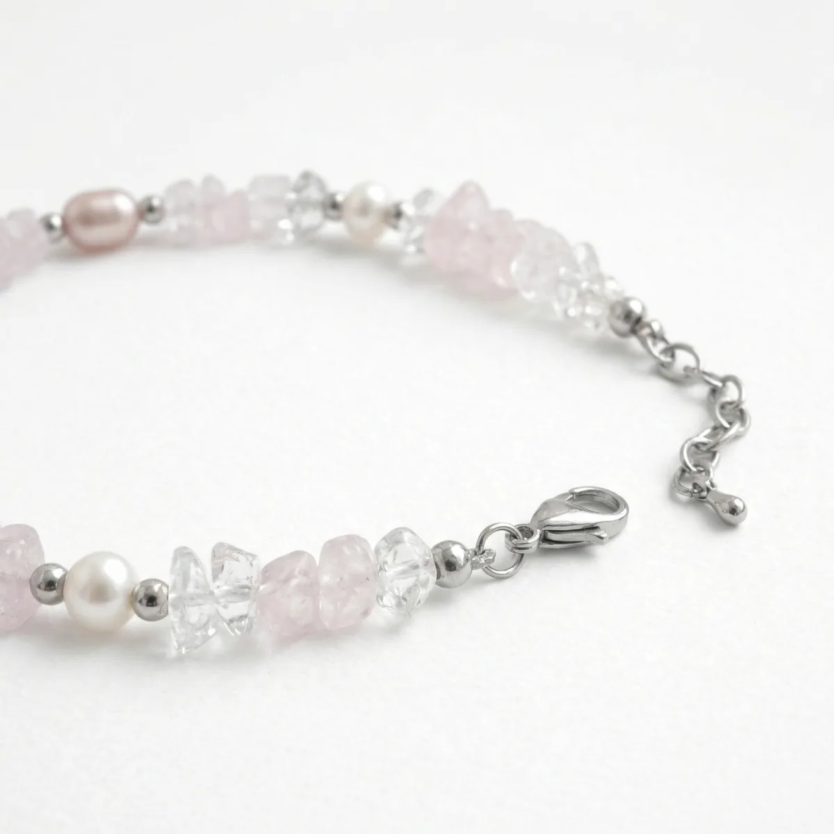 Браслет «Розовый кварц» — изящное украшение с натуральным розовым кварцем, горным хрусталём, жемчугом и серебристыми акцентами. Мягкий оттенок розового кварца подчёркивает женственность и гармонию, а сочетание с прозрачными и белыми деталями выглядит особенно свежо и подходит для светлых, романтичных и повседневных образов.
