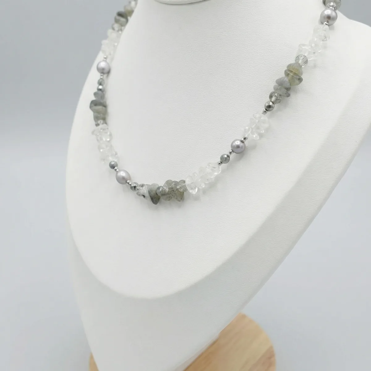 Чокер «Лабрадорит» — стильное украшение из натурального лабрадорита, дополненное горным хрусталём, жемчугом и серебристыми бусинами. Лёгкий, мерцающий отлив лабрадорита создает игру света и неповторимую глубину рисунка камня. Аксессуар универсален и добавит утончённости как повседневному, так и вечернему образу.
