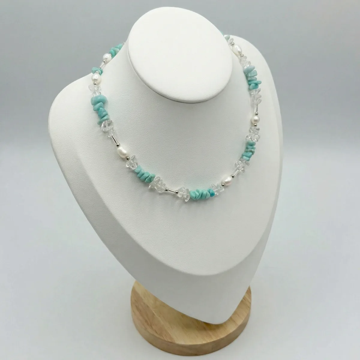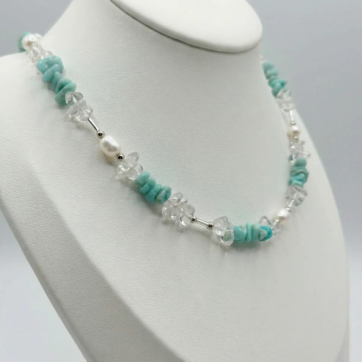 Ларимар, горный хрусталь, жемчуг