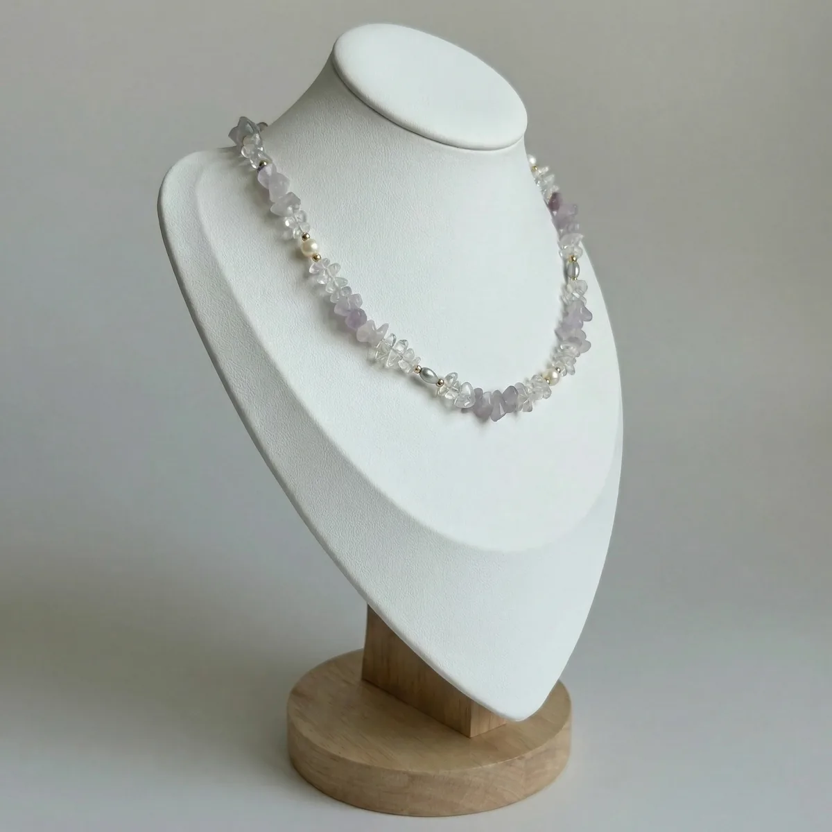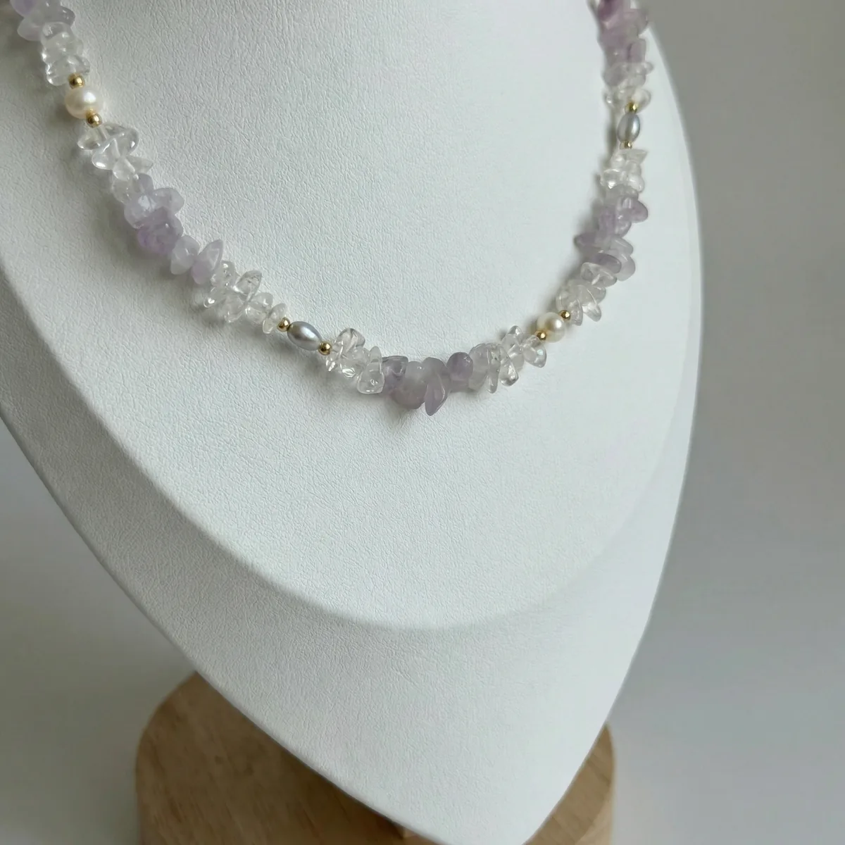 Чокер «Лавандовый аметист» — нежное украшение из натурального лавандового аметиста с добавлением горного хрусталя, жемчуга и золотистых бусин. Воздушная палитра пастельно-сиреневого цвета подчёркивает женственность и уникальность образа. Такой чокер прекрасно подойдёт как к летним, так и к светлым повседневным лукам.