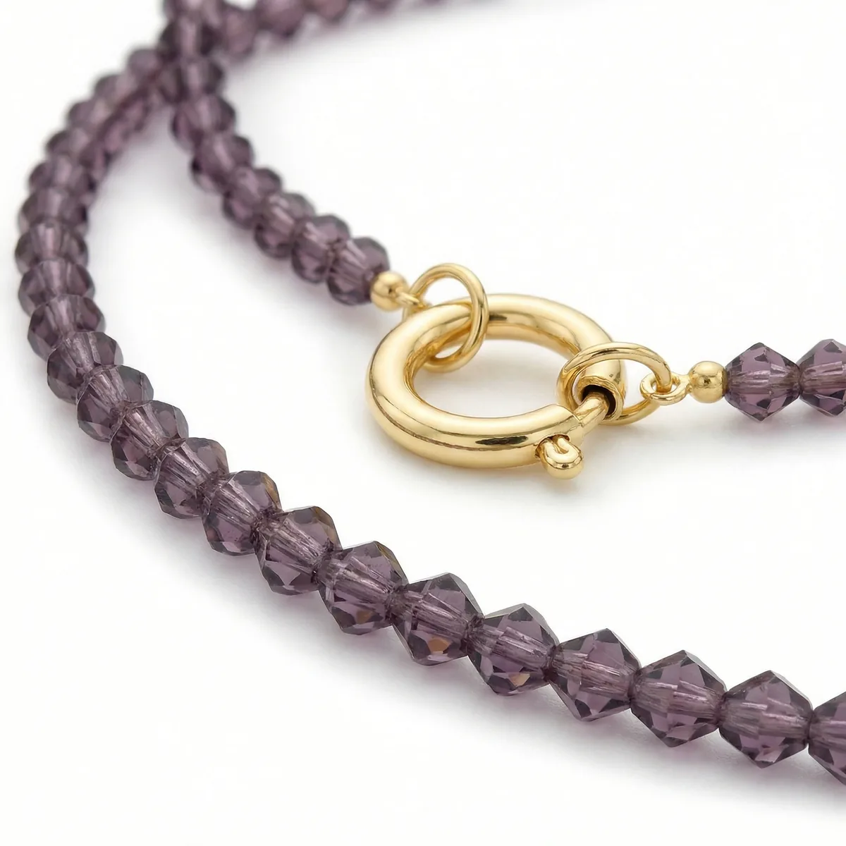 Лёгкий чокер из хрустальных бусин изящного лилового оттенка. Холодный сиреневый тон и деликатное мерцание фасетированных граней красиво играют на свету, добавляя образу мягкости и утончённого настроения.