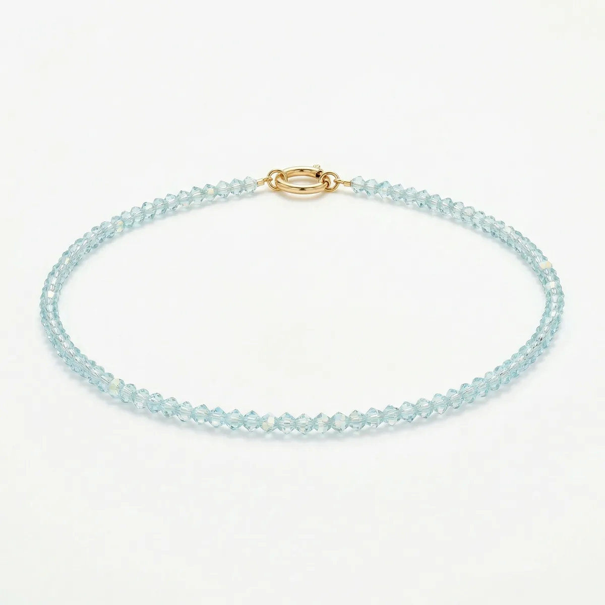 Лёгкий чокер из хрустальных бусин нежного ментолового оттенка. Свежий, прохладный цвет и деликатное сияние фасетированных граней не только украсят любой образ, но и создадут ощущение лёгкости и свежести.