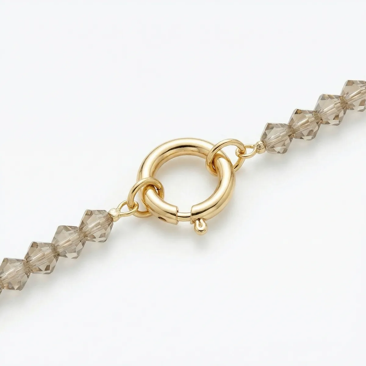 Лёгкий чокер из хрустальных бусин оттенка «шампанское». Светлый бежево-золотистый тон и деликатное сияние фасетированных граней создают мягкое, праздничное мерцание и добавляют образу аккуратной элегантности.