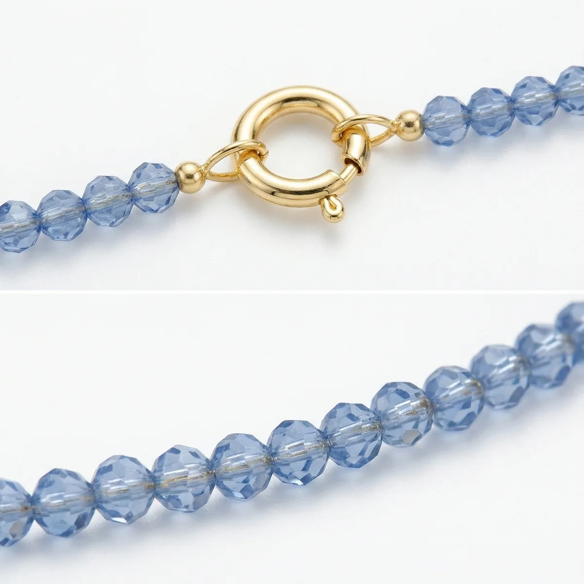 Лёгкий чокер из хрустальных бусин нежного светло-синего оттенка. Небесный, прозрачный цвет и деликатное сияние фасетированных граней не только украсят любой образ, но и создадут ощущение спокойствия и утончённости.