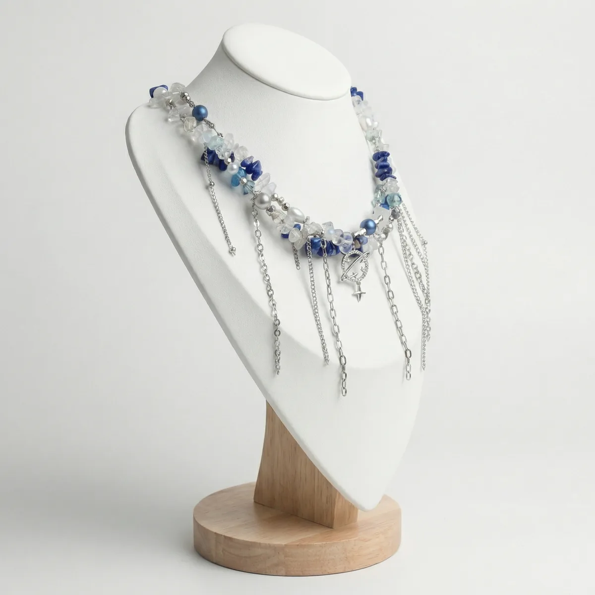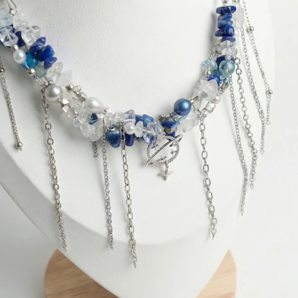 Колье «Лазурит» — акцентное украшение с натуральным лазуритом, прозрачными и перламутровыми бусинами и эффектными подвесками‑цепочками. Глубокий синий, чистый блеск и динамика цепей делают образ свежим и современным, подчёркивают линию шеи и ключиц. Колье хорошо смотрится с однотонными вещами, особенно белого, серого и чёрного цвета.