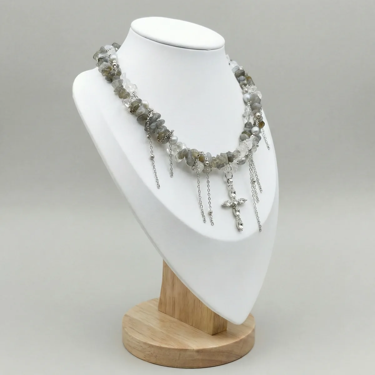 Колье «Лабрадорит» — стильное украшение с натуральным лабрадоритом, прозрачными кристаллами, жемчугом и серебристыми подвесками. Камни с характерным радужным иридисцентным отблеском в сочетании со светлым жемчугом и тонкими цепочками создают многослойный, играющий светом образ. Центральная подвеска-крест добавляет изделию выразительности, а универсальная серая гамма отлично сочетается с любой базовой одеждой.